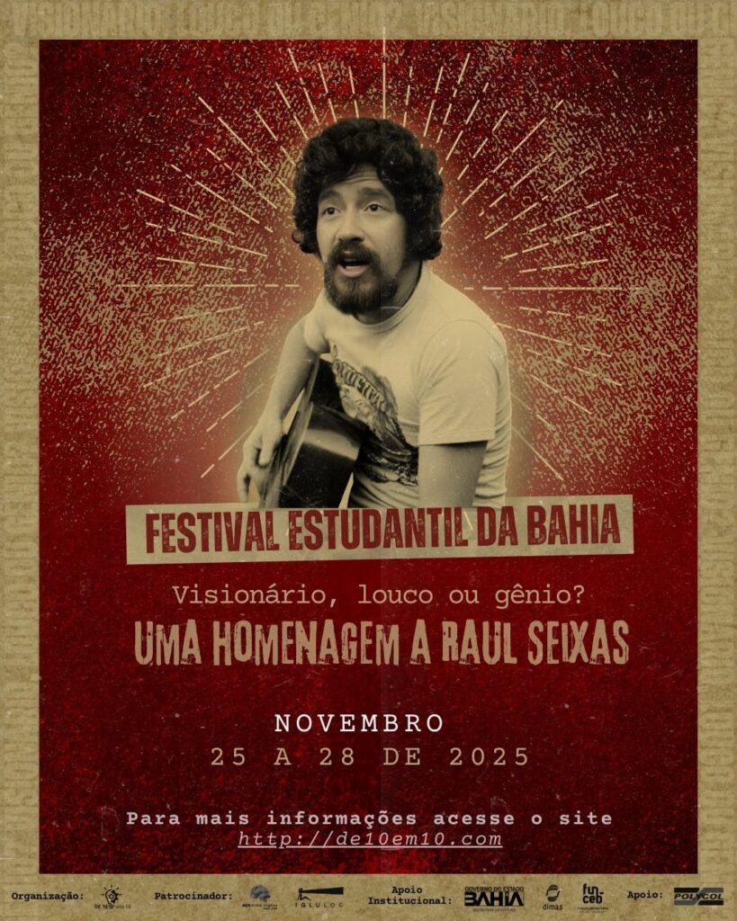 O Festival Estudantil da Bahia 2025 traz o tema "Visionário, Louco ou Gênio?" como convite à juventude baiana para refletir e criar a partir do espírito irreverente e provocador de Raul Seixas.O festival convida estudantes da rede pública, particular, cursos técnicos e universidades da Bahia a participar com curtas-metragens de até 10 minutos, inspirados nas mensagens e letras de Raul Seixas. A trilha sonora original não poderá ser utilizada, mas a essência do artista deve guiar a narrativa — na estética, crítica social ou espírito rebelde.